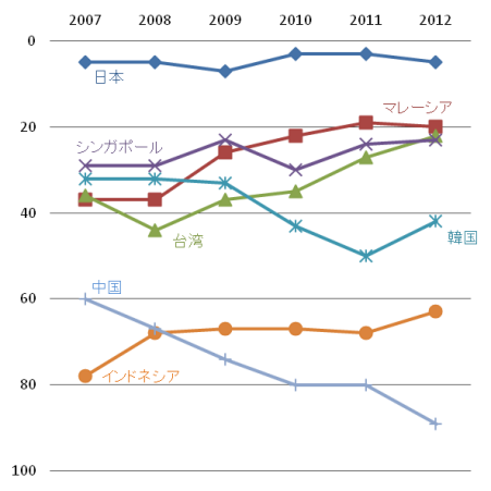 八位の日本(同一三二二)はアジアで唯一、十位以内に入った。日本は〇八年の調査開始から毎年十位以内に入っている。