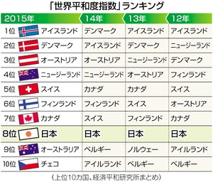 安全保障環境 危機的状況から遠く 日本の「平和指数」4年連続8位