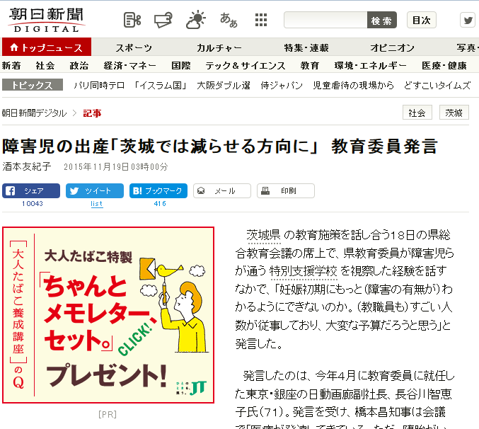 『障害児の出産「茨城では減らせる方向に」教育委員発言』朝日新聞 https://t.co/LuIg2kk7mh