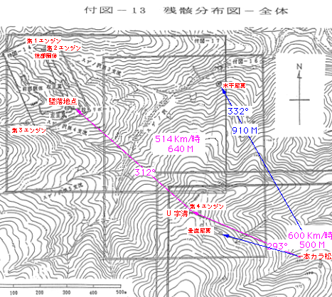 そそいて、「墜落地点」の文字付近に頭から突っ込んでいる。そして、残されたエンジンが惰性で200〜300メートル飛んでいる。