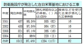 防衛施設庁を舞台にした談合事件が広がりをみせていますが、同庁が発注した在日米軍施設における建設、土木などの工事のうち、落札率(予定価格に占める落札額の割合)が95%を超える工事が八割にのぼることが二日までに明らかになりました。同事件で家宅捜索などを受けた企業も受注しています。日本共産党の吉井英勝衆院議員事務所が調査したもの。一般的に落札率が95%を超える入札は、談合の疑いが高いとされています。