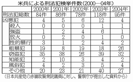 神奈川県横須賀市での女性会社員殺害事件で、米兵が犯行を認めました。米兵が刑法犯で検挙された数は、一九七三年以降で六千九百三十三件に達しています(二〇〇四年まで)。このうち約一割にあたる六百八十三件が、殺人や強盗、放火、性的暴行といった凶悪犯です(日本共産党の赤嶺政賢衆院議員の要求で警察庁が提出した資料から)。