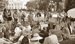 (写真)女性反戦団体コードピンクによる芝生での分科会=13日、ワシントン(山崎伸治撮影)