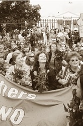 【ワシントン=鎌塚由美】「ノーモア・ウオー(戦争はもういやだ)」――「母の日」反戦行動でワシントンのホワイトハウス前を埋め尽くした女性たちは十四日、バラの花を高く掲げ元気に声をあげました。前日から続いていた「母の日」反戦行動は同日終了。女性たちは「戦争を終わらせるまで私たちは行動を続ける」と決意を固めあいました。