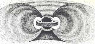 "Finally, there is the Van Allen Radiation Belt (page 69).Just a little over a year ago we didn't even know it existed. Explorer I, equipped to measure the intensity of the previously mentioned cosmic radiation, gave us the first indication that there was something completely unsuspected up there. Two more Explorers unveiled the fact that the earth is surrounded with two concentric, doughnut-shaped rings of "trapped radiation." Electrically charged particles—apparently mainly electrons— endlessly circle around and up and down the magnetic field lines which connect the magnetic North and South Poles like a grid of meridians. When a rocket flies through this belt the trapped electrons impinge on its skin like raindrops hitting an aircraft which is flying through the clouds. Very much in the same fashion as the impinging raindrops cause sound waves audible within the airplane cabin, the impinging electrons produce an electromagnetic radiation inside the cabin. Physicists use for this kind of radiation the German word bremsstrahlung (slow-down radiation), but it is actually something quite similar to X-rays. It is this bremsstrahlung that we have to watch in the Belt." (First Men to the Moon, p.19).