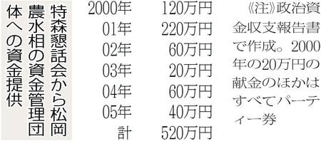 このうち、松岡農水相の資金管理団体「松岡利勝新世紀政経懇話会」は二〇〇〇年に二十万円の献金と百万円分のパーティー券、〇一年には、「松岡利勝君と語る会」など二回のパーティー二百二十万円分など、〇五年までの六年間で計五百二十万円の資金提供がありました。(表参照)
