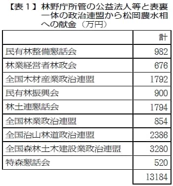 松岡農水相の資金管理団体「松岡利勝新世紀政経懇話会」と、松岡農水相が支部長をつとめる「自民党熊本県第三選挙区支部」は、これらから政治献金やパーティー券の購入などで合計約一億三千万円を受けていました(表1参照)。