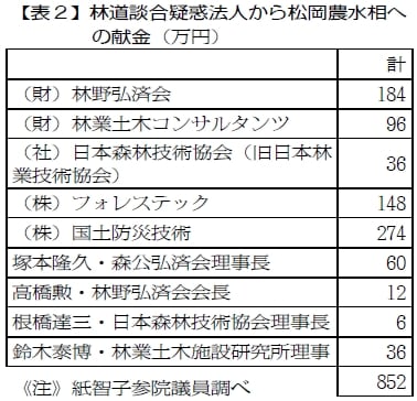 紙議員は、これとは別に緑資源機構の談合事件で公正取引委員会の立入検査をうけた疑惑法人とその代表者個人から受けた献金が計八百五十二万円(表2参照)にのぼることを示し、「返却すべきでないか」と追及しました。