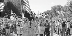 (写真)イラクからの即時撤退を求め、反戦デモの先頭に立つイラク戦争帰還兵=9月15日、ワシントン(鎌塚由美撮影)
