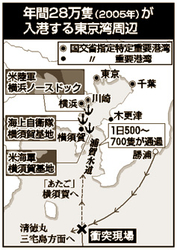 海上自衛隊のイージス艦「あたご」と漁船「清徳丸」の衝突事故が発生した東京湾周辺は、年間約二十八万隻の船舶が入港し(二〇〇五年、国土交通省統計)、世界有数の海上交通量を記録する“超過密水路”です。にもかかわらず、東京湾入り口の横須賀には、米軍・自衛隊の基地があり、米軍・自衛隊の艦船約五十隻が常駐しています。