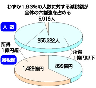 申告所得の合計が百億円を超える人数は、わずか十人、全体の0・004%にすぎません。その減税総額は約百八十三億円に達しました。一人当たりにすると約十八億三千万円もの減税を受けている計算になります。