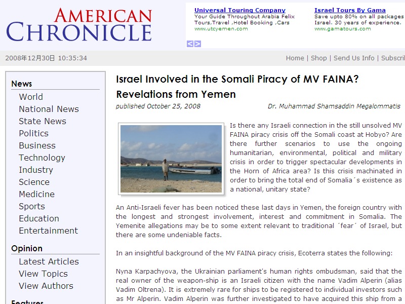 Is there any Israeli connection in the still unsolved MV FAINA piracy crisis off the Somali coast at Hobyo? Are there further scenarios to use the ongoing humanitarian, environmental, political and military crisis in order to trigger spectacular developments in the Horn of Africa area? Is this crisis machinated in order to bring the total end of Somalia´s existence as a national, unitary state?