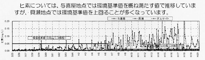 国交省が長年ふせてきたのは同ダム予定地から約10キロ上流にある貝瀬地点などでの環境基準を超えるヒ素濃度データです。現在の環境基準となった1993年以降、毎年のように基準を上回る数値を検出していました。2006年の貝瀬地点の年平均データは基準の12倍、07年には約5倍でした。人体への影響は、下流の利根川で水道用水として取水するため、問題ないとしています。