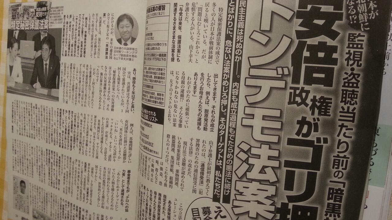 『週刊女性』の秘密保護法企画記事2本を読む。カラー表紙のタイトルは〈まだまだあるトンデモ法案〉〈私たちにできる廃案の仕方〉。読者の関心なのだろうか。強行され仕方ないですまない問題と提起している。共謀罪狙いを的中させ、タイムリー。(津) pic.twitter.com/BJzRm2JBm0