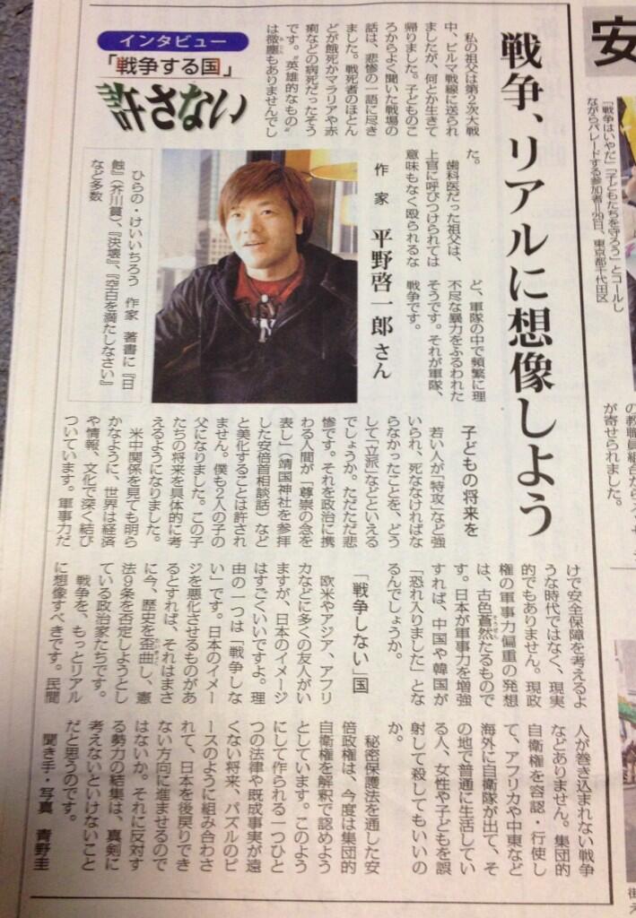 本日の「しんぶん赤旗」1面インタビュー「戦争する国許さない」に、作家の平野啓一郎さんが登場!「若い人が『特攻』など強いられ、死ななければならなかったことを、どうして『立派』などといえるのか」 pic.twitter.com/oMtoROxmoP