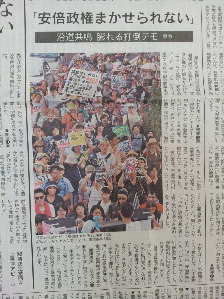 今朝の「しんぶん赤旗」が1面で報じた昨日の「安部やめろ」若者デモ。3000人が参加するという凄いデモになった。それにつけても、「若者は無関心」「白けている」など報じても、いざ若者が立ち上がったら無視する。白けさせるのはマスコミだ。 pic.twitter.com/s4btOk4oS6