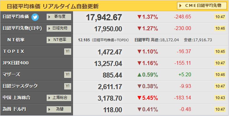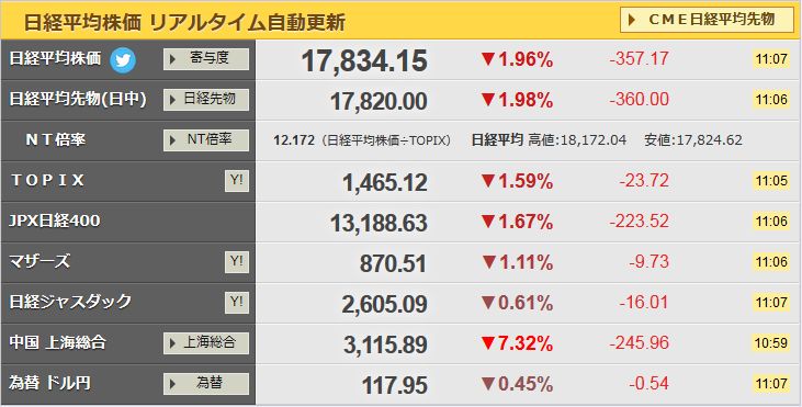 と思ってたら、やはりサーキットブレーカーが発動したようです。15分で5%下落したとか(怖すぎ)。日経平均ももちろんつられて大暴落中です。