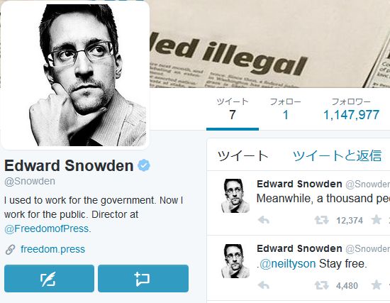 元NSAのスノーデン氏(容疑者?)がツイッターを開設、あっという間にフォロワーが100万人以上に!