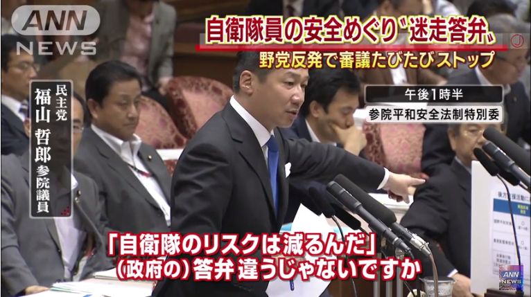 25日の国会で民主党の福山哲郎議員が自衛隊員の安全確保をめぐる質問をしたところ、中谷元・防衛相の答弁が一向に定まらず、国会が再三再四中断し、午前の部の途中でそのままお昼休憩となりました。