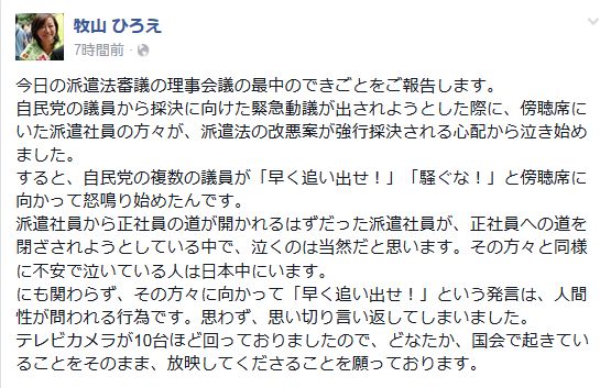 【鬼?悪魔?】自民議員が派遣法審議で泣き始めた傍聴席の派遣社員に対して「早く追い出せ!」「騒ぐな!」と怒鳴る!
