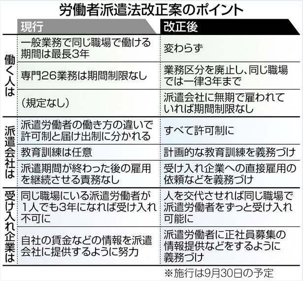働く人を交代させれば企業が派遣労働者を使い続けられるようにする労働者派遣法改正案は九日の参院本会議で、自民、公明両党などの賛成多数で可決されました。改正案は施行日を今月一日から三十日に修正したため再び衆院に送られ、十一日の本会議で成立する見通しです。