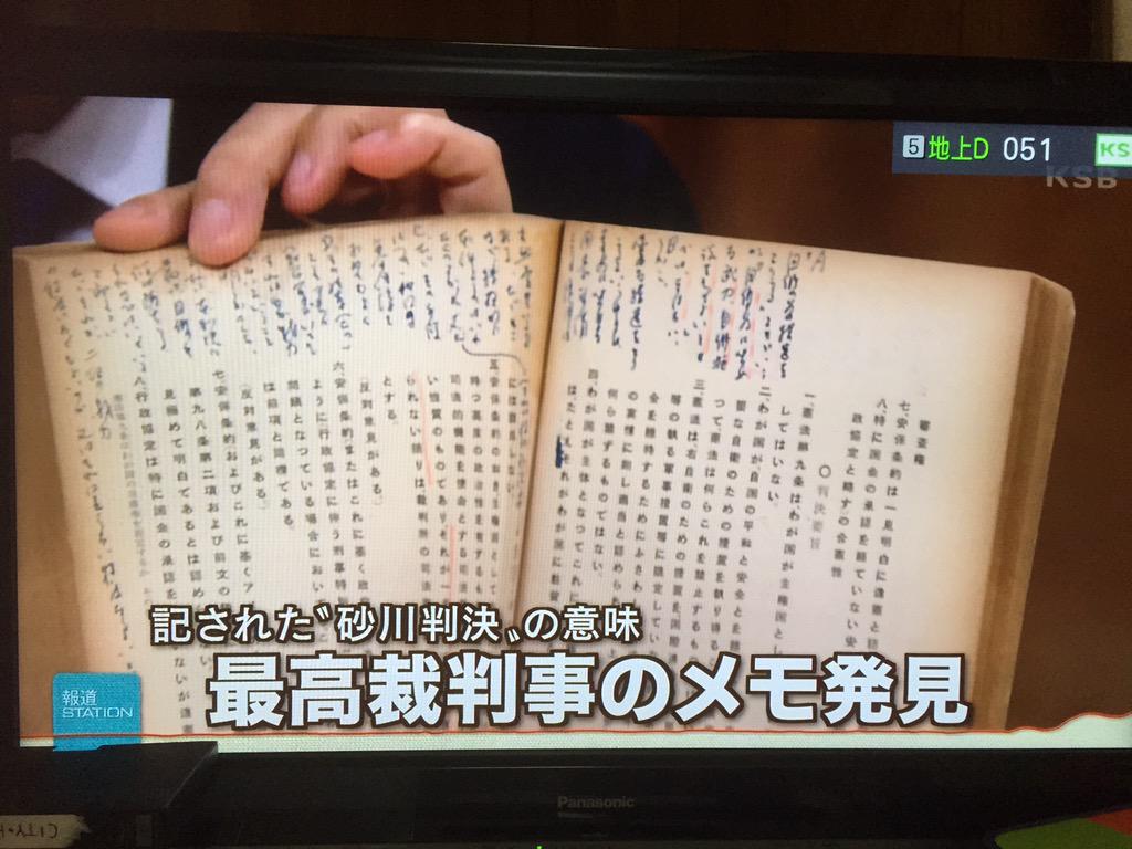 報道ステーション。砂川判決に加わった入江最高裁判事のメモを発見。『判決では「自衛の措置は取りうる」と言っているが「自衛の為の戦力や施設を取りうる」とは言っていない』…って。砂川判決は米軍駐留を認めただけで、集団的自衛権どころか自衛隊も違憲と言っているではないか。