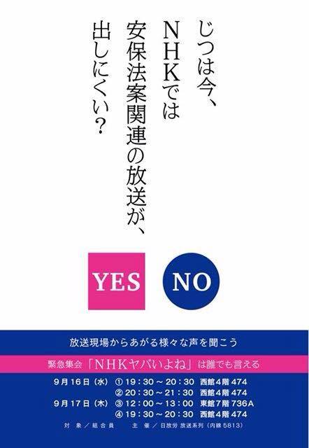 【遅すぎ】NHK(安倍広報)職員が立ち上がる:”労組緊急集会「NHKヤバいよね」は誰でも言える”が開催