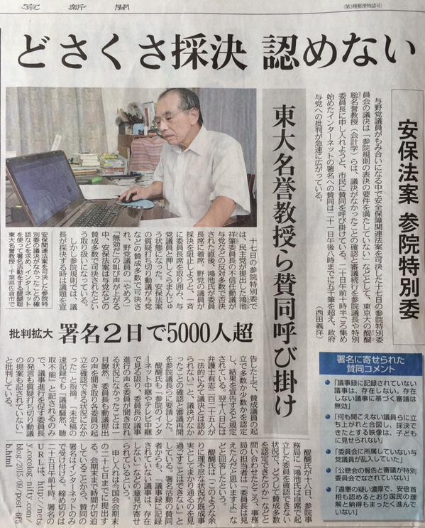 先に賛同した緊急署名が新聞でも報道。25日締切です。署名→http://t.co/EiAoNIiavd / “東京新聞:安保法案 どさくさ採決は認めない 東大名誉教授ら賛同呼び掛け:社会(TOKYO Web)” http://t.co/L5poI6L9cC