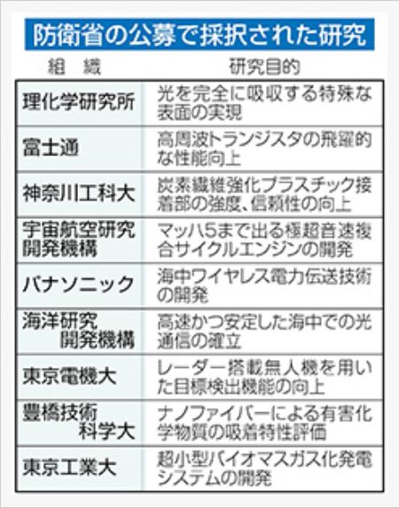 軍事技術に応用できる基礎研究に防衛省が研究費を支給する初の公募で、東京工業大など4大学と理化学研究所、宇宙航空研究開発機構(JAXA)、パナソニックなどの計9件が採択されたことが24日、防衛省への取材で分かった。同省は25日に結果を公表する。