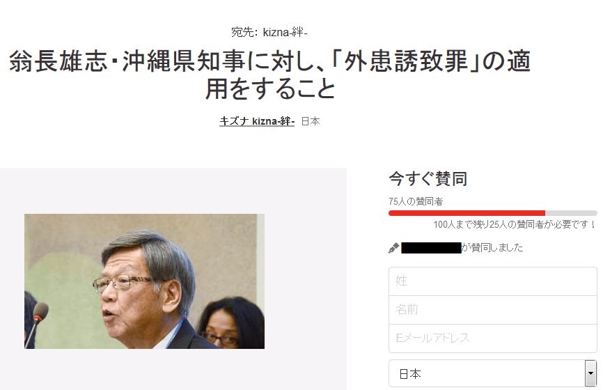 【拡散希望】キャンペーン「kizna-絆-: 翁長雄志・沖縄県知事に対し、「外患誘致罪」の適用をすること」 に賛同をお願いします! https://t.co/k4v5PxNJyt @change_jpさんから