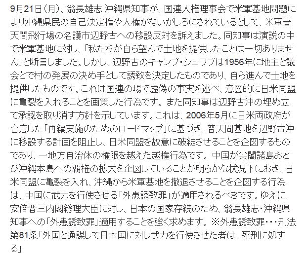9月21日(月)、翁長雄志 沖縄県知事が、国連人権理事会で米軍基地問題により沖縄県民の自己決定権や人権がないがしろにされているとして、米軍普天間飛行場の名護市辺野古への移設反対を訴えました。同知事は演説の中で米軍基地に対し、「私たちが自ら望んで土地を提供したことは一切ありません」と断言しました。しかし、辺野古のキャンプ・シュワブは1956年に地主と議会とで村の発展の決め手として誘致を決定したものであり、自ら進んで土地を提供したものです。これは国連の場で虚偽の事実を述べ、意図的に日米同盟に亀裂を入れることを画策した行為です。 また同知事は辺野古沖の埋め立て承認を取り消す方針を示しています。これは、2006年5月に日米両政府が合意した「再編実施のためのロードマップ」に基づき、普天間基地を辺野古沖に移設する計画を阻止し、日米同盟を故意に破綻させることを企図するものであり、一地方自治体の権限を越えた越権行為です。 中国が尖閣諸島おとび沖縄本島への覇権の拡大を企図していることが明らかな状況下におき、日米同盟に亀裂を入れ、沖縄から米軍基地を撤退させることを企図する行為は、中国に武力を行使させる「外患誘致罪」が適用されるべきです。ゆえに、安倍晋三内閣総理大臣に対し、日本の国家存続のため、翁長雄志・沖縄県知事への「外患誘致罪」適用することを強く求めます。 ※外患誘致罪・・・刑法第81条「外国と通謀して日本国に対し武力を行使させた者は、死刑に処する」
