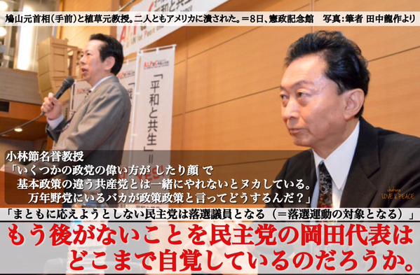 反集団的自衛権、反原発、反TPPで【オールジャパン平和と共生】を。鳩山、小池(共産党)で盛り上がり。今、最大の課題安倍を倒す、一人区でリベラル勢力候補一名に。憲政会館400人会場に700名。立ち見。安倍倒すのが最優先 ,無料1時間http://t.co/QfP4YnZIuW