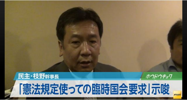 枝野氏は、衆参いずれかで4分の1以上の議員の求めがあれば内閣は臨時国会を召集しなければならないとした同条について、「使うことも視野に入れている」と述べた。