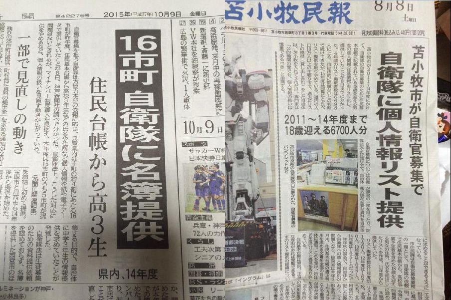 これ自衛隊から要請されても個人情報を提供していない市もあるわけですよね。勝手に個人情報を漏えいするのはぜひやめて欲しいですね。さらに、記事中には自衛隊が中3の名簿まで求めたとあります。