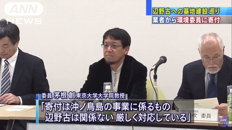 「辺野古の護岸建設工事や環境調査業務を受注する建設会社やコンサルタント会社から委員就任決定後に寄付金を受けていた。寄付の大半は、業者の事業受注後に実施されていた」