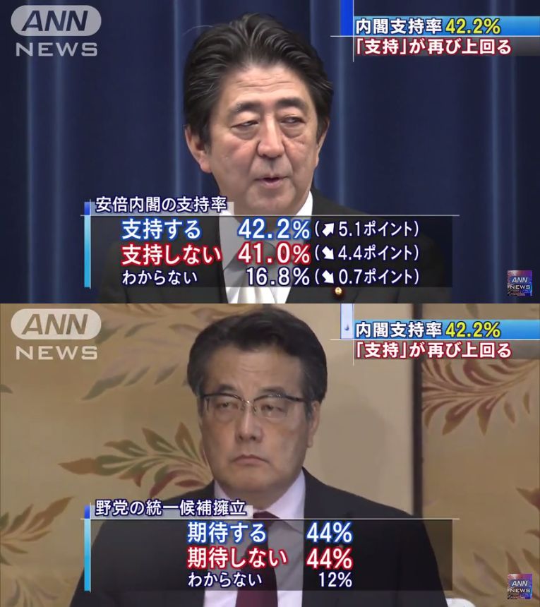 【興味深い数字】安倍内閣支持42%不支持41%野党の統一候補期待する44%期待しない44%テレビ朝日世論調査