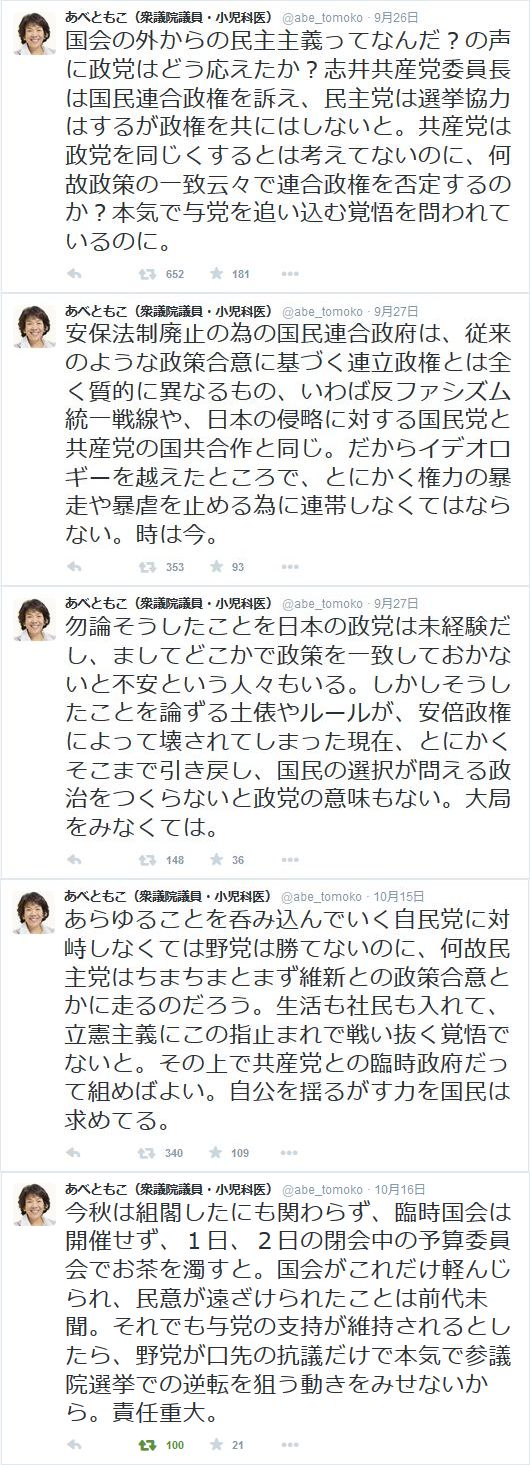 — あべともこ(衆議院議員・小児科医) (@abe_tomoko) 2015, 10月 16