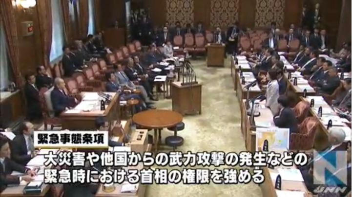 「緊急事態条項は大災害時や有事(戦争)での政府・国会の権限や議員の任期を定めるもので、自民党が2012年にまとめた憲法改正草案にも盛り込まれた。」