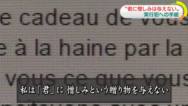 パリの同時テロ事件で妻を亡くした男性が実行犯たちに宛てた手紙をフェイスブックに投稿し、「私と息子は、世界中のどの軍隊よりも強い。怒りでは応じずに自由に生きることこそが、君をはずかしめるだろう」と述べ、憎しみを憎しみで返さない姿勢に、共感が広がっています。