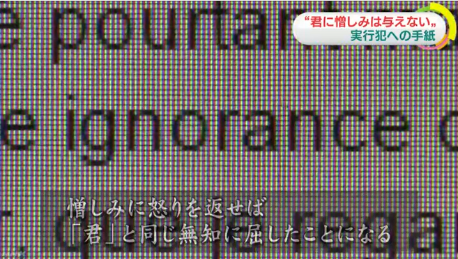 自分がこの方の立場だったらと思うと心乱れますが、遺族の方が事件後間もない段階で「憎しみを憎しみで返さない姿勢」「報復は何も解決しない、相手の思うつぼだ」ということを公言してくれたのは大きいです。