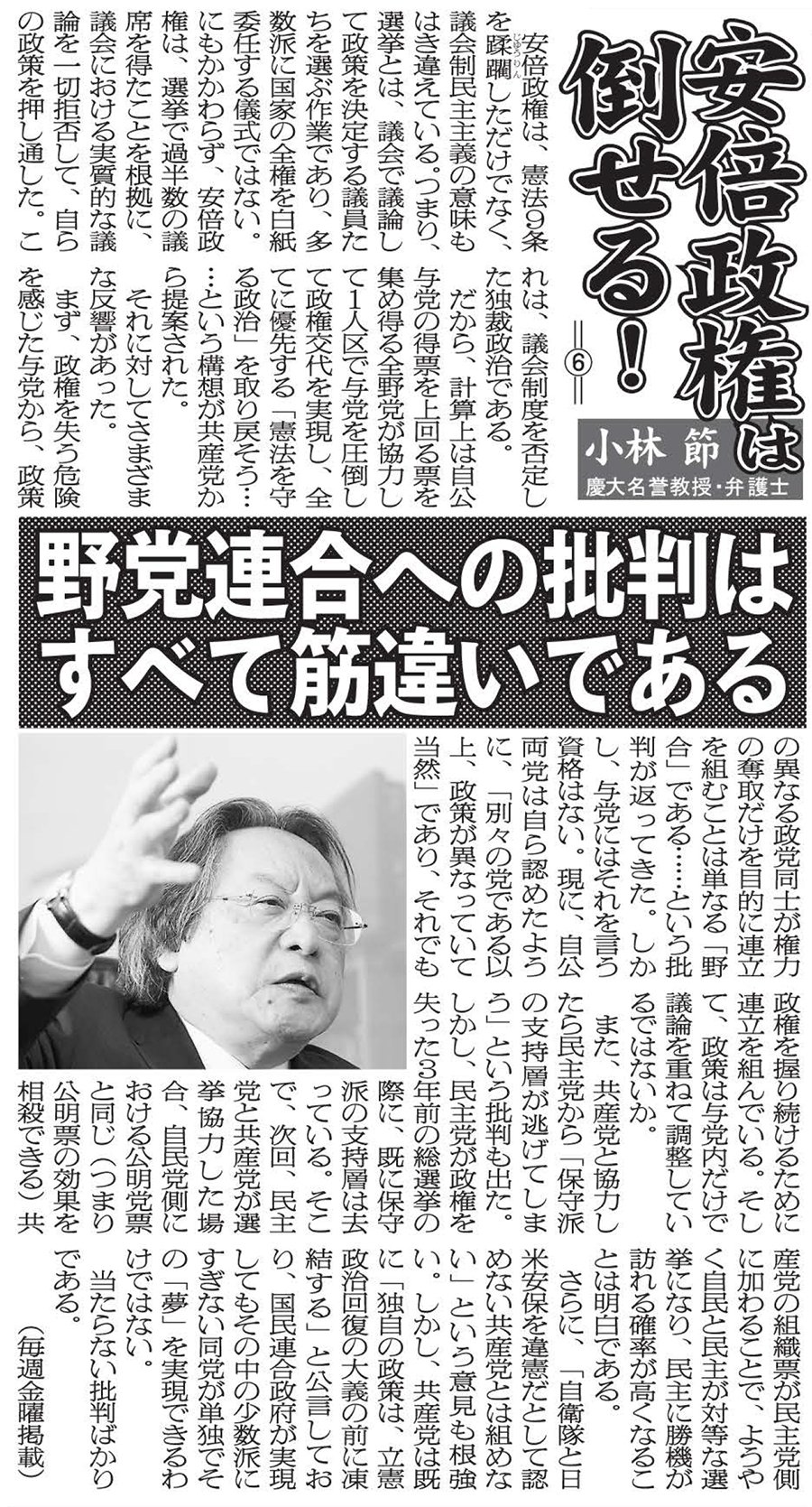 【正論】小林節慶応大名誉教授「与党に野党連合を批判する資格はない!」「政策が違う自・公が与党であるために連立を組んでいる」