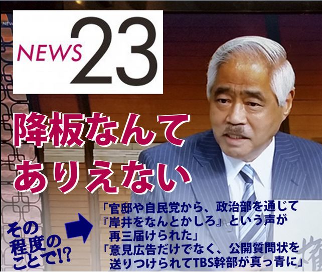 「岸井のNEWS23担当は月曜日から木曜日までだ。とりあえず月曜日から木曜日まではTBSのNEWS23にチャンネルをあわせてほしい。視聴率が高ければ、いま押しくらまんじゅうしているところ、とりあえずの動きはそうだということをぜひ皆さんにお願いしたい。岸井は私と違って、たたかれ慣れていない男だ。ただ私も今、必死に支えている。ただ、安倍からみると、私が支えていることが岸井にとっていいことなのかどうか、ということもあるが、ぜひ支えてあげてほしい。」
