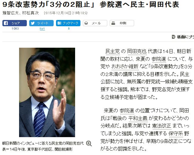 「民主党の岡田克也代表は14日、朝日新聞の取材に応じ、来夏の参院選について、与党やおおさか維新など『9条改憲勢力』を3分の2未満の議席に抑える目標を示した」