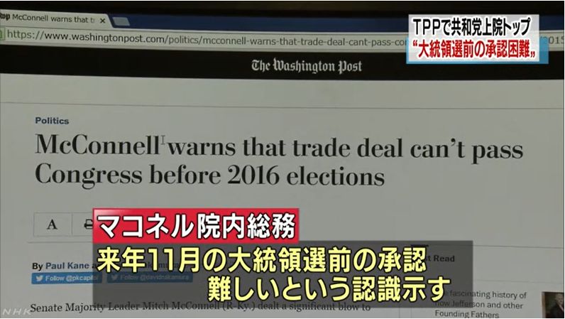 米上院共和党リーダーのマコネル院内総務が十一日、環太平洋連携協定(TPP)の批准に向けた米議会の承認の審議を二〇一六年十一月の大統領選挙前に開始しない方針を明らかにしたことで、TPP発効の先行きが急速に見通せなくなってきた。