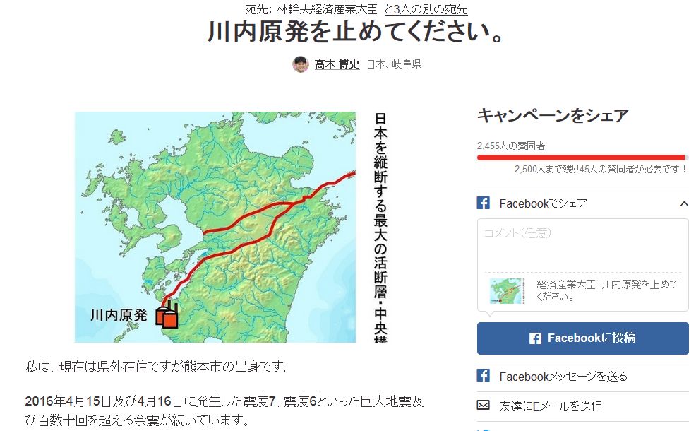 キャンペーン「経済産業大臣: 川内原発を止めてください。」 に賛同をお願いします! https://t.co/LTFifj6XuW @change_jpさんから