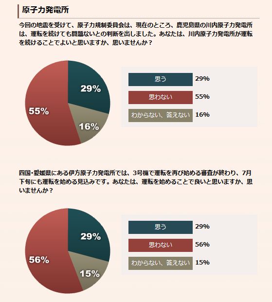 日本人の半数以上(55%)はまともで「川内原発を止めろ」と言っているんですが、どうも現状が理解できない人たちが3分の1弱(29%)いるんですよね。原発推進・反対関係なく、現状(避難経路が破たん)ストップしなければならないのは当然の話です。