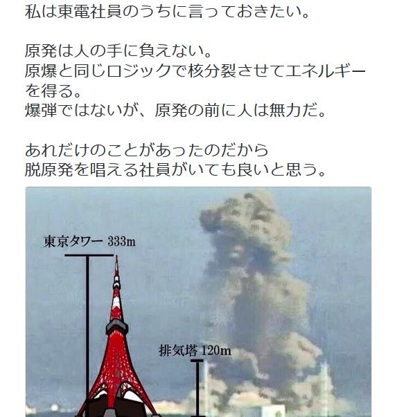 現役東電社員の方「私は東電社員のうちに言っておきたい。原発は人の手に負えない。あれだけのことがあったのだから 脱原発を唱える社員がいても良いと思う。」