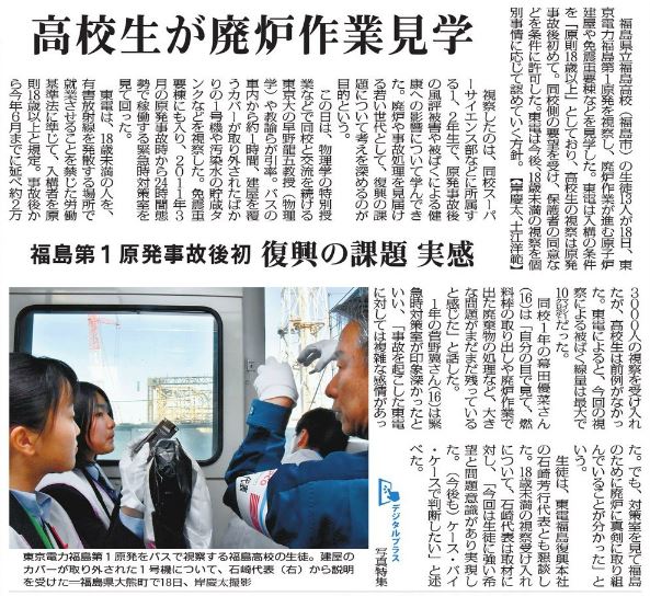 視察したのは、同校スーパーサイエンス部などに所属する1、2年生で、原発事故後の風評被害や被ばくによる健康への影響について学んできた。廃炉や事故処理を見届ける若い世代として、復興の課題について考えを深めるのが目的という。