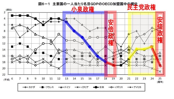 @satoto_m @haru1ban294 民主党政権時代は一度たりとも順位下がってなく、むしろ上がってるんですよね。一方小泉政権時代と安倍政権時代(第1期、第2期)は一度たりとも順位上がってない。アベノミクスってGDP下げる政策?