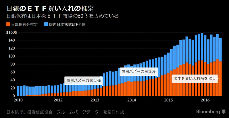 ブルームバーグの集計によると、8月初旬時点で日経平均株価を構成する225銘柄のうち、75%で日銀が大株主上位10位以内に入っており、楽器・音響のヤマハに至っては既に事実上の筆頭株主状態にある。日銀が今回、ETF購入枠を従来の約2倍へ拡大したことで、年内にはセコムやカシオ計算機でも筆頭株主化し、2017年末には55銘柄まで増加する見通しだ。